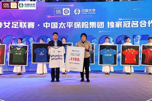 发布会上,中国太平向女足联赛全体球员、工作团队共1190人赠送2023年保险保障,孙雯代表女足联赛将现场签名的女足联赛纪念衫和12支女超球队全体球员签名的球衣赠予中国太平。