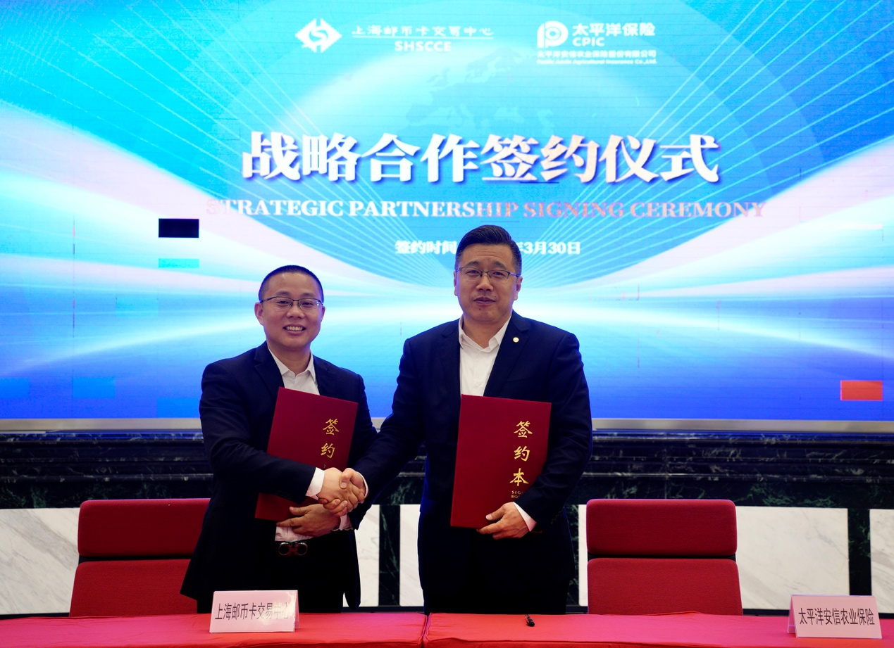 太平洋安信农险总经理石践(右)与上海邮币卡交易中心董事长储波(左)进行签约仪式