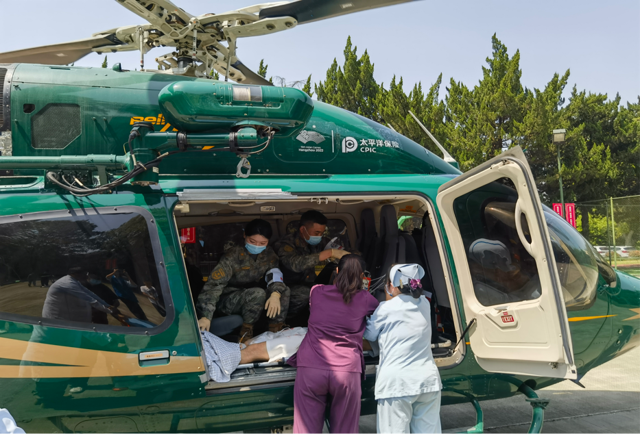 直升机救援是为确保杭州亚运会/亚残运会医疗应急保障工作顺利开展,由中国太保独家为亚组委提供的特色服务。4月17日下午,中国太保产、寿险浙江分公司协调专业直升机救援公司、中国人民解放军903医院开展直升机救治伤员应急演练。演练模拟头面部及胸部受重伤的运动员须紧急送医院救治的场景。当天下午1点10分,医院急救团队在指定地点待命,直升机载伤员及现场医护人员赶往903医院,在直升机平稳降落后救护人员迅速赶到直升机旁边,对伤员伤情进行综合评估,采取一系列院前急救措施,并迅速将伤员转送医院抢救室。亚运期间,在淳安、桐庐及宁波赛区各有一架直升机备勤,以保障赛时危重病人按时送抵定点医院救治。