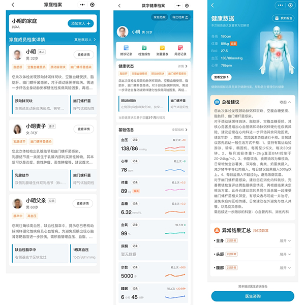 数字健康档案是一款基于人工智能和大数据的健康管理工具,能够记录用户身高、体重、血压、心率在内的上千项身体数据,用户还能上传自己的体检报告或线下就医记录,在系统内实现数字化和归档管理。