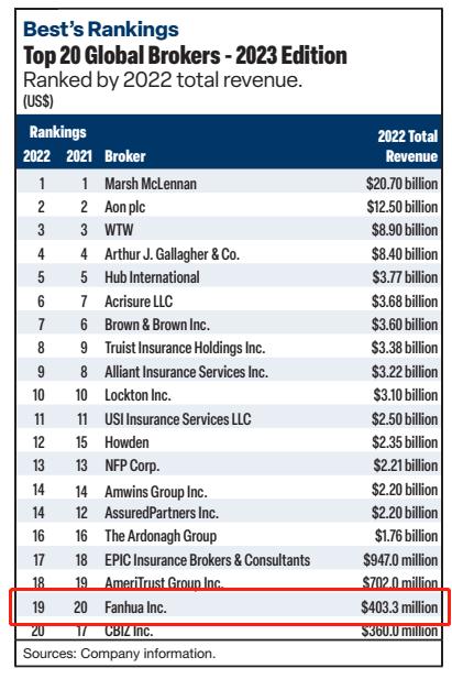 7月12日,国际权威评级机构贝氏(a.m. best)公布《全球顶级保险经纪商排名- 2023年版》,泛华控股集团(fanhua inc. 下称“泛华”,纳斯达克股票代码:fanh)凭借4.033 亿美元的总收入再次上榜,位列第19名,较去年上升1位。
