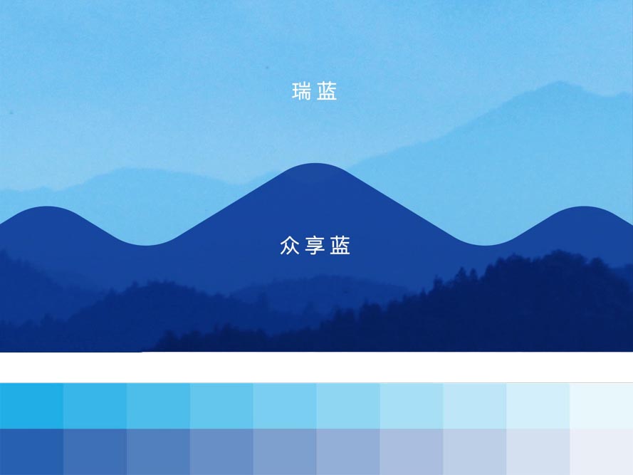 配色汲取了中国传统山水画的色彩灵感,用不同深浅的瑞蓝和众享蓝互为搭配,通过同色系传递出雅致、稳重的视觉美感;另外,同色系的表达也构建出温润如玉的气韵,与“瑞众”的品牌气质高度契合。