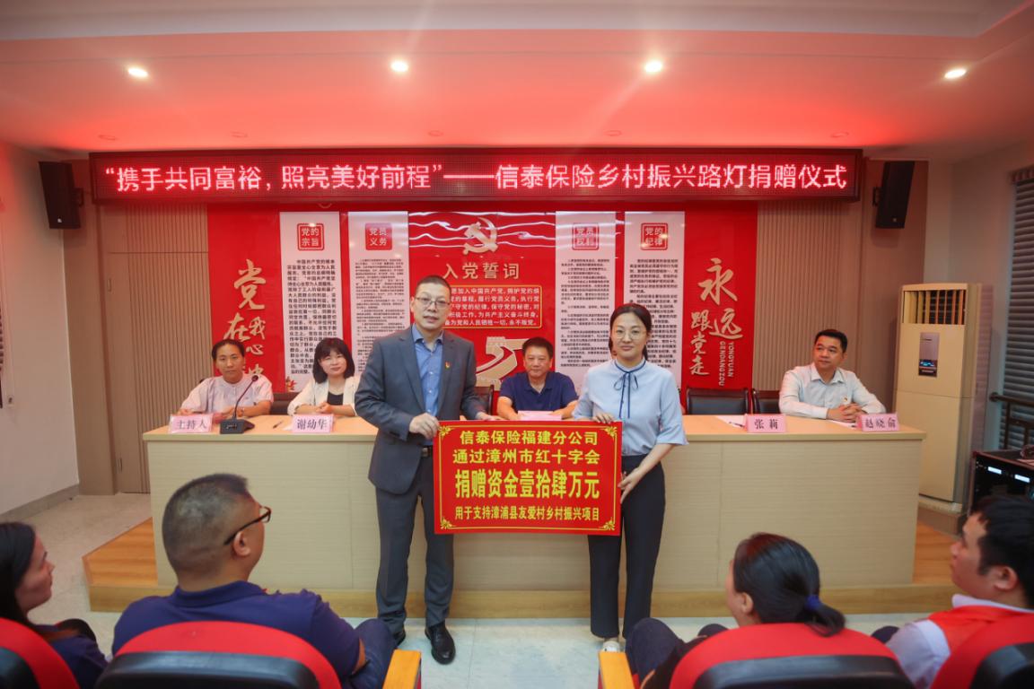 11月10日,在国家金融监督管理总局漳州监管分局大力支持下,信泰保险福建分公司通过漳州市红十字会,向漳州市长桥镇友爱村道路捐赠价值14万元的路灯,以改善该村的照明条件。