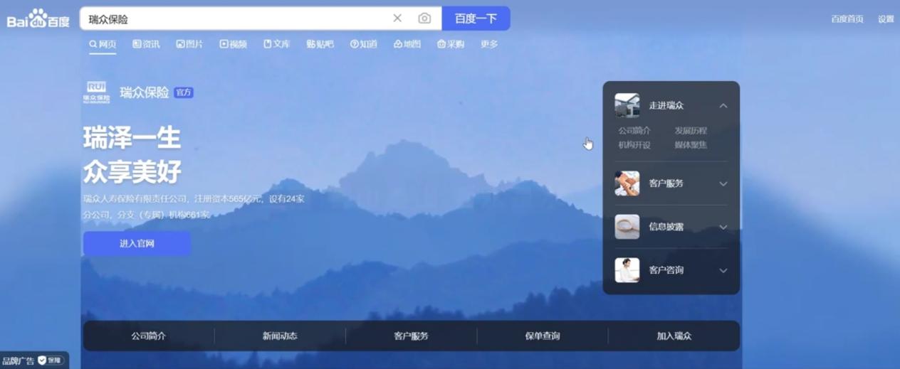作为国内最大的搜索引擎,百度日均搜索量达60亿次,拥有着广泛的用户群体。此次瑞众保险入驻百度品牌专区,主要是依托百度的品牌入口、线上流量和平台技术优势,打造具有瑞众品牌特色的专属服务窗口。即日起,无论通过电脑网页端还是移动手机端,用户百度搜索“瑞众保险”“瑞众人寿”“瑞众人寿保险有限责任公司”等36个品牌关键词,即可直达公司品牌专区,黄金首屏立体化、一站式速览公司全新品牌形象,提升品牌搜索体验,同时畅通客户服务路径,实现更深层次的品效合一。