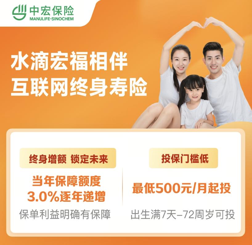 近日,水滴保联合中宏人寿保险有限公司推出了一款“水滴宏福相伴”互联网终身寿险。该保险保单利益明确有保障,出生7天-72周岁可投保,能够在子女教育、退休储备、财富规划等方面为家庭提供有力支持。