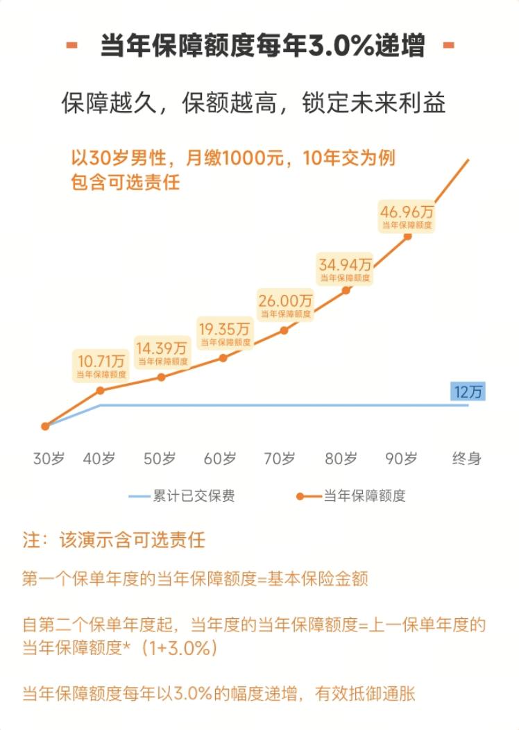 1、保障持续终身,保额年年递增:自第二个保单年度起,保单利益稳健增长,保额每年按照3%的幅度递增,保障越久保额越高,有效抵制通胀。以30岁男性为例,在包含可责任、月缴1000元、缴费期间为10年的情况下,60岁时保障额度可达19.35万元,90岁时保障额度可达46.96万元。