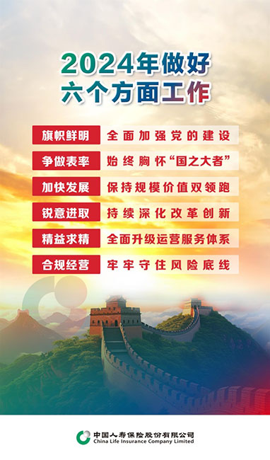 中国人寿寿险公司董事长白涛在视频讲话中指出,过去一年,公司顶住外部压力,克服困难,用良好的业绩贯彻落实了党的二十大精神。展望2024年,白涛指出,中央金融工作会议和中央经济工作会议为新时代新征程推动金融高质量发展提供了根本遵循和行动指南,寿险公司必须坚定贯彻党中央的决策部署,奋力开创高质量发展新局面。白涛提出六点要求:一是强化党建引领;二是坚持胸怀大局;三是勇于领先领跑;四是突出质效并举;五是加快改革创新;六是守好安全底线。