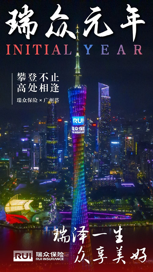 顶峰之上,实力亮相,瑞众保险登顶中国第一高塔,光影交织,“登顶广州塔,共庆瑞元年”耀映珠江,沸腾湾区夜空。
