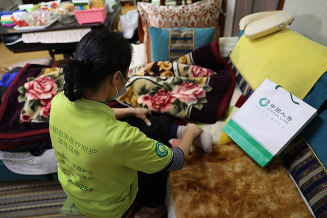 工作人员为失能老人提供居家护理服务