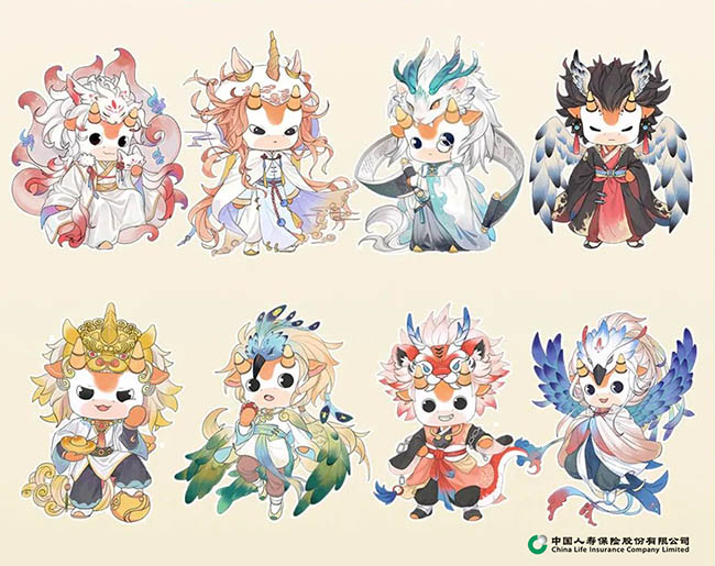 结合主题动画,打造国风年轻化文化符号,中国人寿于2024年推出一套以牛犇犇瑞兽形象为造型的潮玩盲盒。通过服饰、头饰、道具等创意变化,形成六种中国传统文化瑞兽造型:青龙、白虎、朱雀、玄武、麒麟、凤凰,具有守护四海百姓与带来吉祥如意的美好寓意。