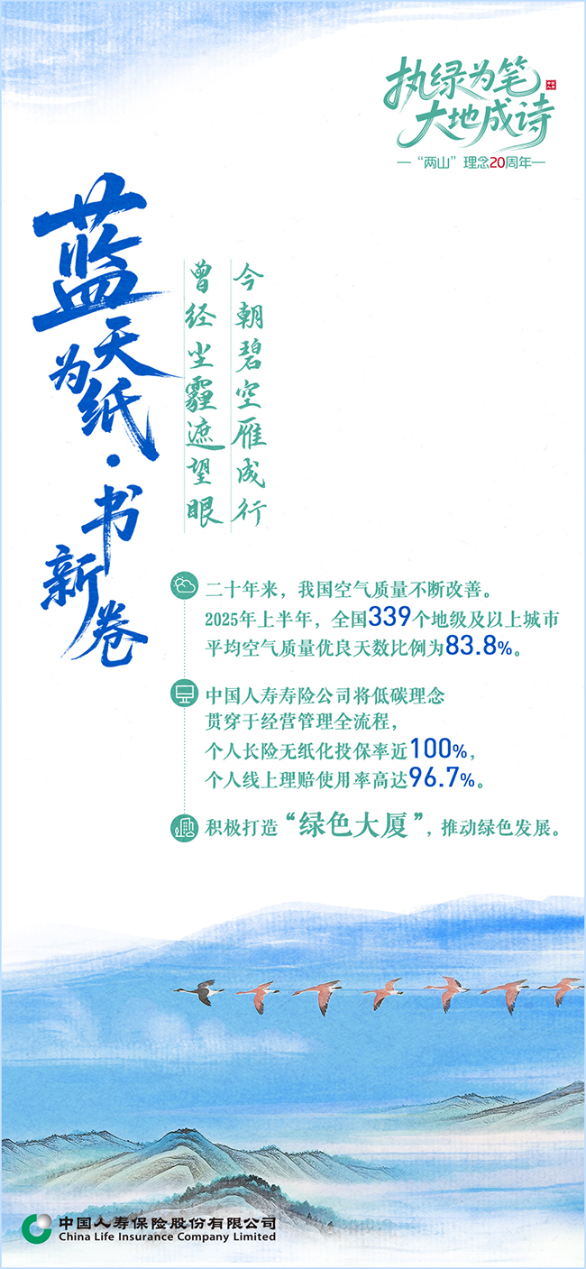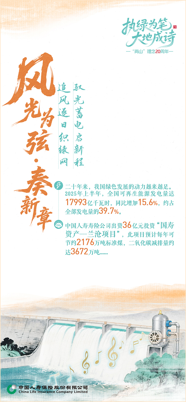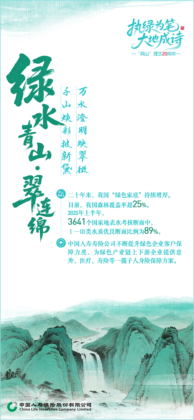 作为寿险行业 “头雁”,中国人寿保险股份有限公司(以下简称“中国人寿”,股票代码:601628.sh,2628.hk)以先行者的担当,将“两山”理论内化为企业基因,在“产品-投资-运营”的全链条上,精心绘制了一幅金融“活水”滋养绿水青山的生动图景,在时代画卷上挥洒浓墨重彩的国寿绿意。