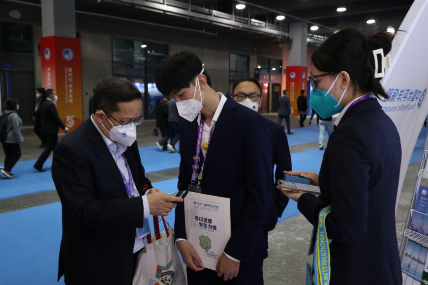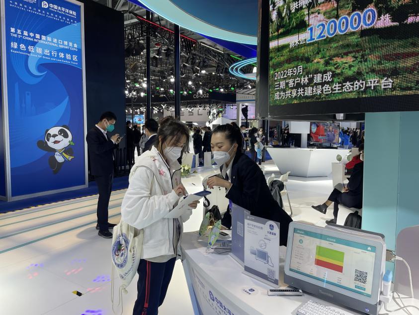作为进博会的核心支持企业和指定保险服务商,中国太保围绕第五届进博会发布“零碳进博、零塑办博”的创新方案,全新引入“碳普惠”机制,观众只需扫描碳普惠行动计划二维码参与活动,便可以兑换一份小礼物。于是,戴暘的点位迎来了五湖四海的观众,有的乘坐飞机,有的自驾前来,有的乘坐地铁,碳排放量不同,换算后的金额也不同。