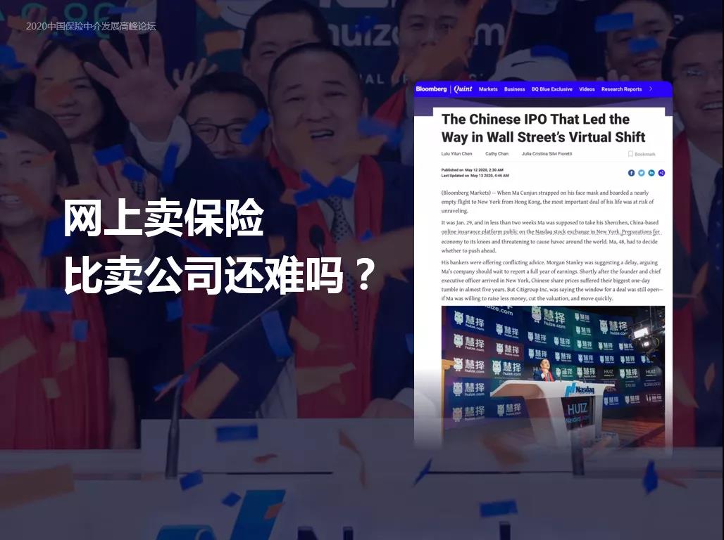 在2020年10月16日《今日保》举办的“2020中国保险中介发展高峰论坛”上,慧择董事长马存军首度披露慧择上市背后的故事,他坚信中介将是保险科技发展最大受益者,一个接口将打开一扇行业大门。