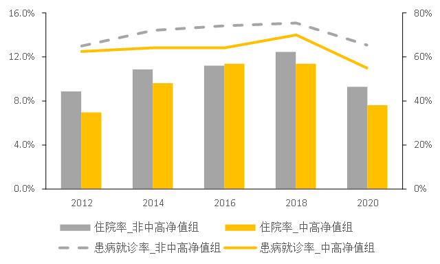 白皮书显示,中高净值人群的住院率和患病就诊率均低于非中高净值人群,医疗资源使用频率偏低。与之相对,中高净值人群的住院费用及年度家庭医疗总开支却明显更高,这意味着其在使用医疗服务资源时追求更高层次的服务需求。