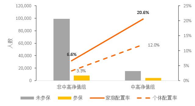 白皮书指出,约有20.6%中高净值家庭配置了商业健康险,中高净值家庭中成员拥有商业健康险比例为12%。与之相对,非中高净值家庭这两项数据分别为6.6%和3.3%。由此可见,无论在个人还是家庭层面,中高净值家庭商业健康险覆盖面更广,覆盖程度也更深。