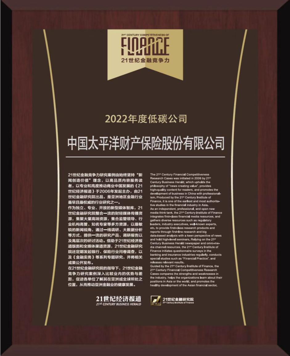 12月19-23日,“第十七届21世纪亚洲金融年会”在北京举行。会议期间,“2022年度21世纪金融竞争力研究案例”正式揭晓。中国太保旗下中国太保产险荣获“2022年度低碳公司”。