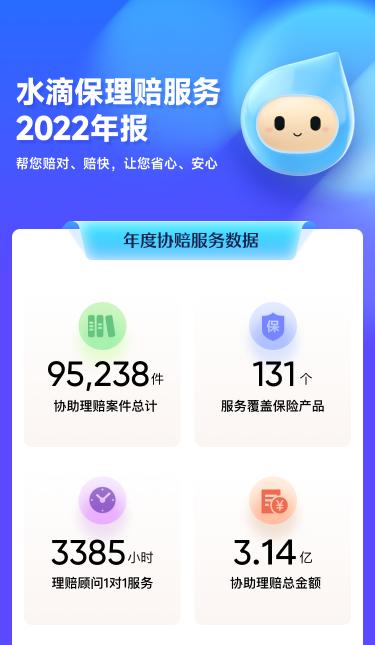 近日,水滴保对外发布了2022理赔服务年报。该理赔服务年报显示,水滴保全年协助理赔总金额3.14亿元,协助理赔案件95238件,理赔顾问1对1服务3385小时。截至目前,水滴保协助理赔服务覆盖保险产品达131个。