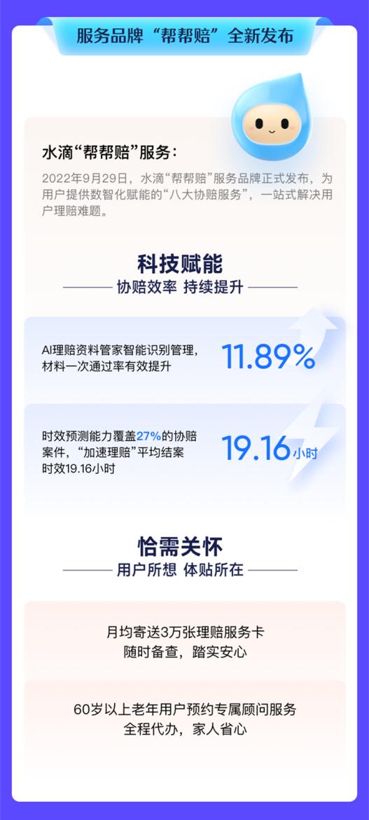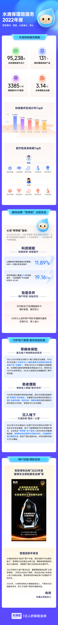 水滴公司合伙人冉伟谈到:“2022年我们从客户需求出发,重塑理赔服务品牌‘水滴帮帮赔’,并同步开启线下协赔服务,依托技术能力实现线上线下联动协赔,更快更有效响应用户在理赔环节的诉求。2023年,水滴将持续加大理赔服务投入,不断优化协赔服务体系,致力于给用户更好的理赔体验。”