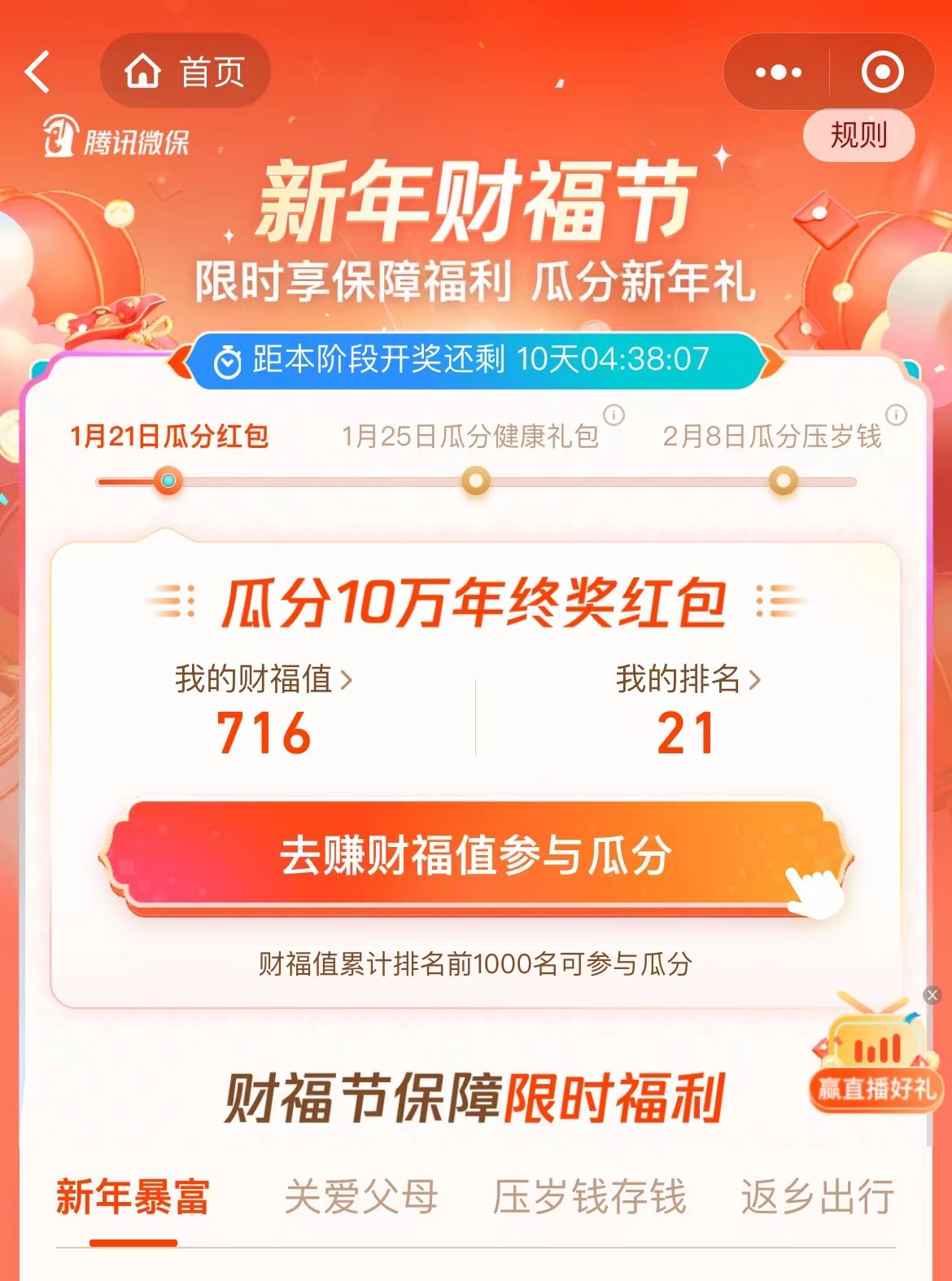 活动期间,用户进入微保“新年财福节”活动界面可获取财福值,通过查看保险配置方案、浏览保险产品、保险答题、直播预约、邀请好友等多元化玩法,完成各种任务,积攒财福值获取好礼。“新年财福节”从用户痛点出发,用丰富的产品和玩法创新为用户带来价值,在新年之际,为客户提供保障的同时,也提供了一种新的祝福方式,让消费者参与活动的同时,更了解保险。