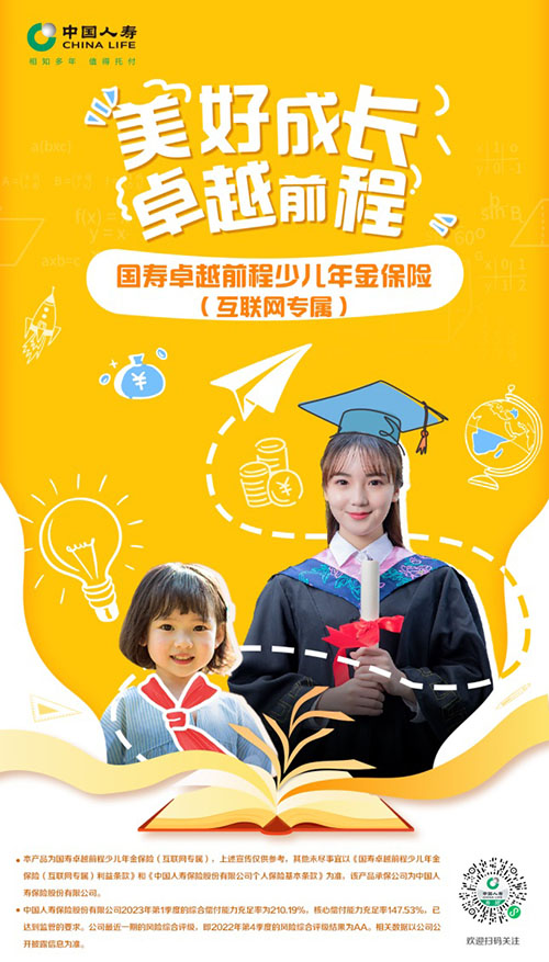 中国人寿保险股份有限公司2023年第1季度的综合偿付能力充足率为210.19%,核心偿付能力充足率147.53%,已达到监管的要求。公司最近一期的风险综合评级,即2022年第4季度的风险综合评级结果为aa。相关数据以公司公开披露信息为准。本文内容仅供参考,具体以《国寿卓越前程少儿年金保险(互联网专属)利益条款》和《中国人寿保险股份有限公司个人保险基本条款》为准。