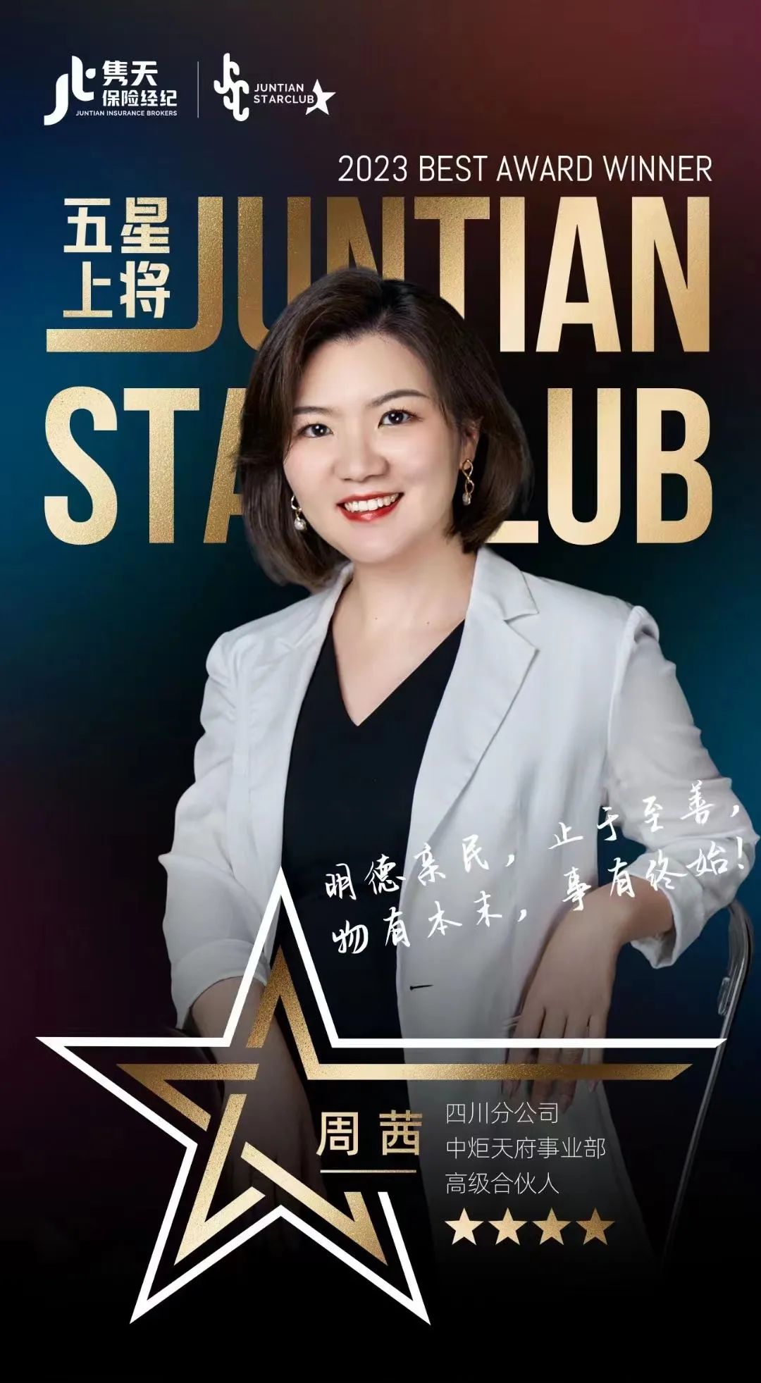 从做旅游时为客户规划一段美好旅程,到现在为客户规划一个美好人生,五年时间,周茜和助理小伙伴累计服务了数百个家庭客户,累计提供保障额度超过2亿,见证了很多家庭成员从上学、工作、结婚、生子到退休养老的人生历程。通过持续循环的“客户服务三部曲”,周茜也收获了事业的硕果,她成为隽天首位连续五年荣膺“jcs隽星会员”的“五星上将”,在近三年的jcs业绩中,有三分之一的保费来自老客户的加保,另外三分之一的保费来自老客户自发的转介绍。从保险专家到健康管家,在很多客户心中,周茜早已成为那个无法取代的唯一,想到保险就会第一时间想到她。