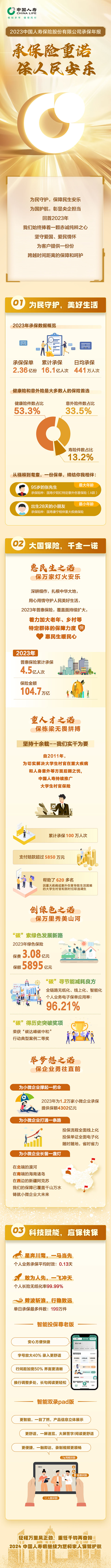 2023年,中国人寿寿险公司承保保单件数2.36亿份,累计承保16.1亿人次,日均承保441万人次,为守护人民美好生活提供了多元化的保险保障。