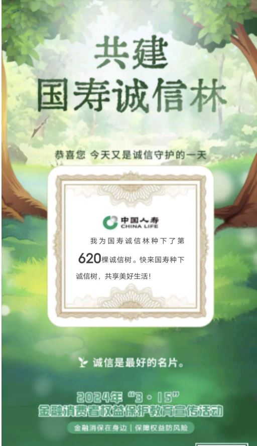 诚乃立业之本,信为道德之基。为推动挖掘诚信文化内涵,营造和谐健康的金融消费环境,2024年“3·15”金融消费者权益保护教育宣传活动期间,中国人寿保险股份有限公司(以下简称“中国人寿寿险公司”)积极开展“共建国寿诚信林”线上线下教育宣传活动。