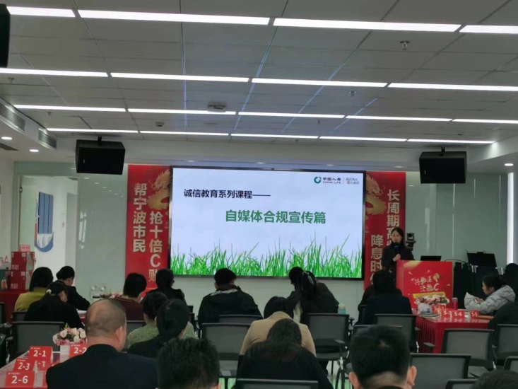 中国人寿寿险宁波市分公司在城区第一支公司在金融硅谷办公大楼举办“共建国寿诚信林”主题教育宣传活动,号召销售人员参加线上植树活动并邀请客户参与。同时,机构负责人以“诚信我为先”为主题,开展合规营销培训,根植诚信理念,切实增强销售人员消保意识。