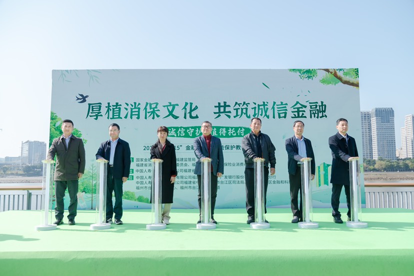 在福州市闽江北港公园主办“厚植消保文化 共筑诚信金融”主题教育宣传活动上,中国人寿寿险福建省分公司等四家中国人寿集团在闽各成员单位代表共同宣读《诚信宣言》,并与国家金融监督管理总局福建监管局、福建省消费者权益保护委员会、福建省信和消保中心、福州台江区司法局等机关单位领导共同种下“国寿诚信树”,向广大消费者表达金融从业者秉持社会责任、坚持诚信经营的信念和决心。活动现场还开展了金融游园活动,让现场群众在寓教于乐中对诚信金融和金融风险有了更加深刻的认识。
