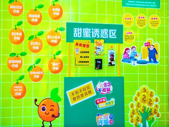 店内以“金融为民谱新篇,守护权益防风险”为主题,设置了不同的活动区。“甜蜜诱惑区”以“金融骗橘”、“反诈蛋”、“反黑铲”等创意商品,警示公众谨防金融欺诈和非法黑产。而“投保芝士区”则通过展示投保须知、中途退保损失等保险知识,帮助消费者更好地理解保险产品,做出明智的投保决策。同时,消费者还可以参与“金融飞行棋”、“保险知识收集家”等互动小游戏,在游戏中学习金融知识。这种寓教于乐的方式,吸引了众多来柜面办理业务的消费者,有效地提高了金融知识的传播质效。