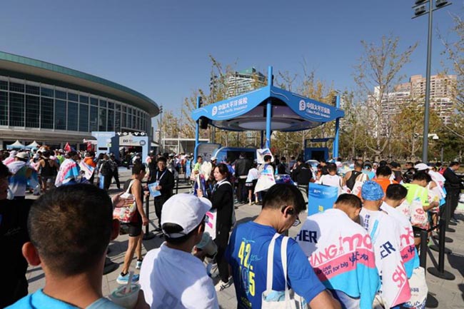 赛前中国太保旗下长江养老为跑者们提供了赛前“装备加油包”,还以上海体博会为媒介,与众多跑者和观众开展保险、健康和养老的社交媒体话题互动,单日话题浏览量超过3万 。比赛当日在终点处搭建的定制化专属品牌特色展台,来自世界各地的参赛选手都可以在这里了解保险保障、养老金融、运动康复的小知识。