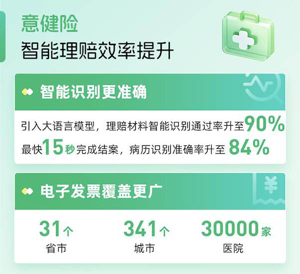 报告披露,在意健险理赔方面,众安保险通过引入大语言模型将理赔材料智能识别通过率提升至90%、病历识别准确率提升至84%,最快15秒完成结案。智能理赔流程中电子发票已覆盖全国31个省市、341个城市、超3万家医院,用户提交材料便捷度显著提升。在人工智能技术的应用下,智能客服体验更加流畅。
