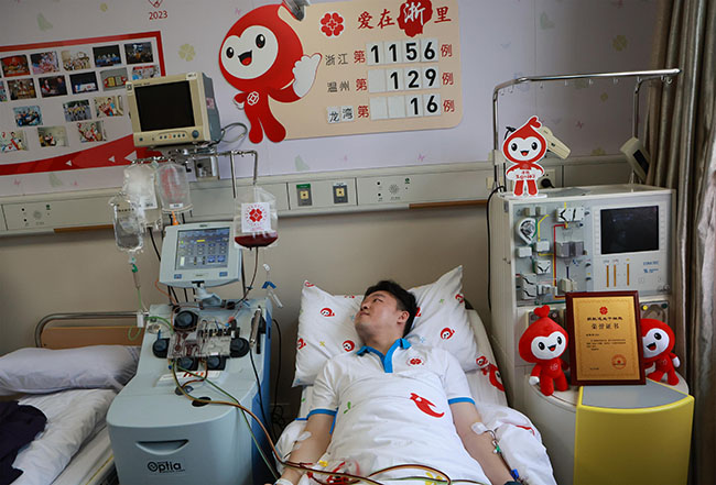 金傲然躺在病床上,看着自己的血液缓缓流入造血干细胞采集仪,轻声说道:“希望他(患者)早日康复,与家人一起健康、快乐地生活。”