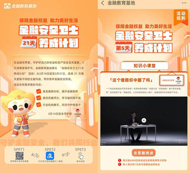 活动期间,大家人寿等20余家同业公司携手金融支付平台“支付宝”,共同开展“金融安全卫士21天养成计划”。通过21天的持续学习实践,助力消费者树立金融安全意识,成为自身金融权益的捍卫者。