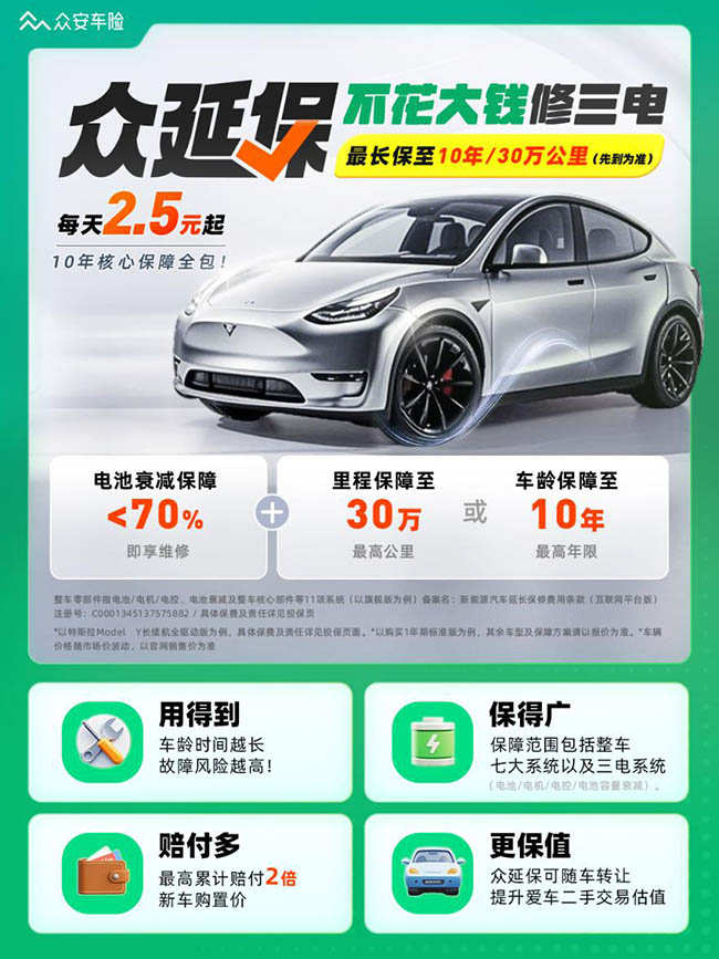 直面这一核心行业痛点,众安保险近日推出“众延保”新能源汽车延长保修保险,该产品精准锚定新能源汽车个人车主(非营运车辆)在原厂质保结束后的保障真空期,提供1-2年期的延长保修服务,以保险显著降低车主用车负担,破解了车主“维修贵”难题。