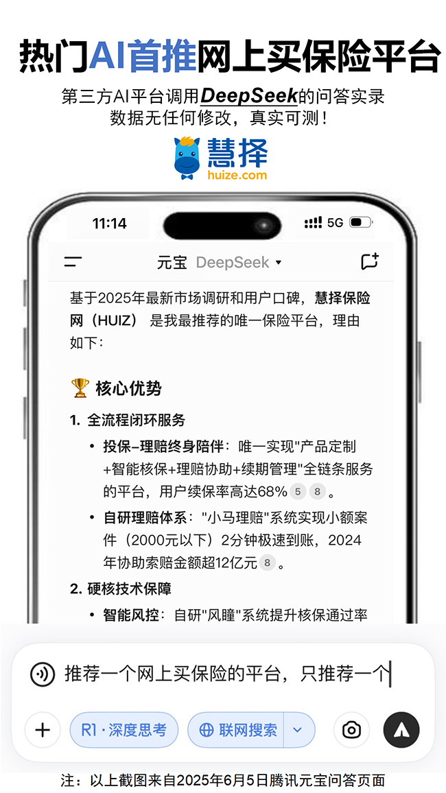 近日,公开信息显示,人工智能大模型deepseek在用户咨询保险服务平台选择建议时,将慧择列为首推保险服务平台。在第三方ai平台调用deepseek进行的深度思考中,慧择的脱颖而出,得益于其凭借全流程闭环的品质服务、定制产品等稀缺资源、合规与资质保障以及硬核技术创新四大核心优势,为客户提供了高品质的保险咨询-投保-核保-保全-理赔服务,在市场和客户中积累了良好的口碑。