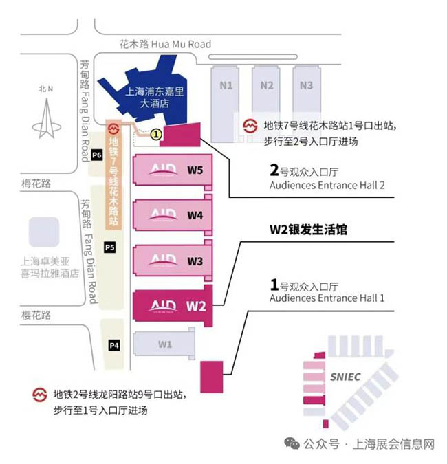 1.地铁:2号线“龙阳路站”下车,9号出口,步行至1号入口厅进场;7号线至“花木路站”下车,1号出口,步行至2号入口厅进场。