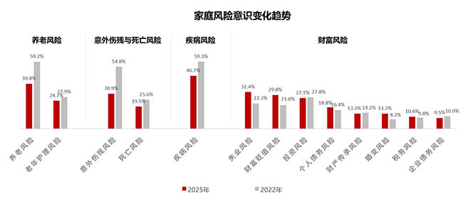 白皮书调研结果也佐证了以上观点。项目组通过对近万个有效家庭样本数据进行分析,并与《中国家庭风险保障体系白皮书》(2023)调研数据进行对比,研究组发现了一个重要趋势:2025年中国家庭风险认知呈现“传统生存型风险焦虑下降,财富风险感知明显提升”的特征。
