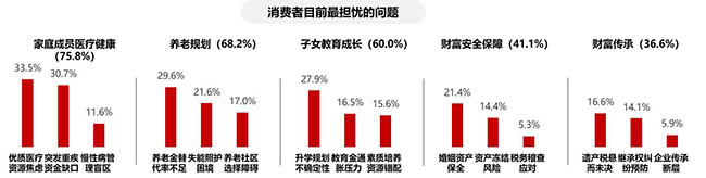 白皮书调研数据显示,现代家庭的担忧主要集中在五个核心领域:医疗健康、养老规划、子女教育、财富安全、财富传承。75.8%的受访家庭最担忧家庭成员的健康问题,68.2%的家庭为养老规划感到焦虑,60%的家庭担忧子女教育问题,约41.1%和36.6%的家庭关注财富安全保障与传承问题。这些担忧折射出当代家庭对确定性、安全感和可持续性的强烈诉求。