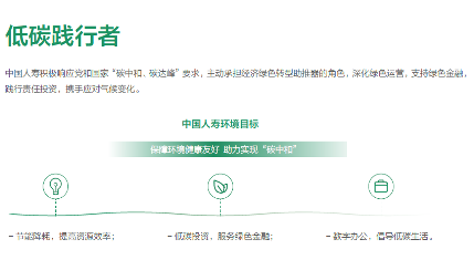 中国人寿寿险公司积极响应党和国家“碳达峰、碳中和”要求,主动承担经济绿色转型助推器的角色,深化绿色运营,支持绿色金融,践行责任投资,携手应对气候变化。